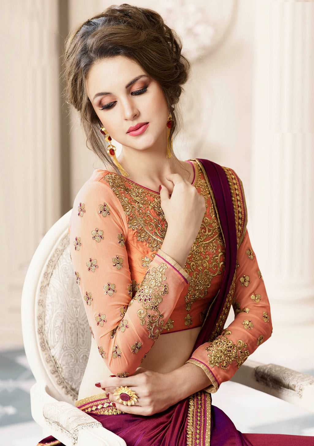 Wine Silk Saree with Heavy Zari, resham embroidery with stone work and lace border ColorSaree: WineBlouse: Peach FabricSaree: SilkBlouse: Sleeve-Georgette Customised: 40" Work: Heavy Zari, resham embroidery with stone work and lace border...